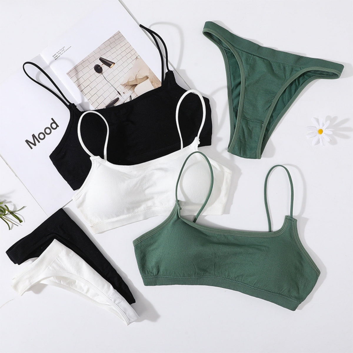 The packs contain matching lingerie sets, each set including a bra and panties designed with the same fabric and style.